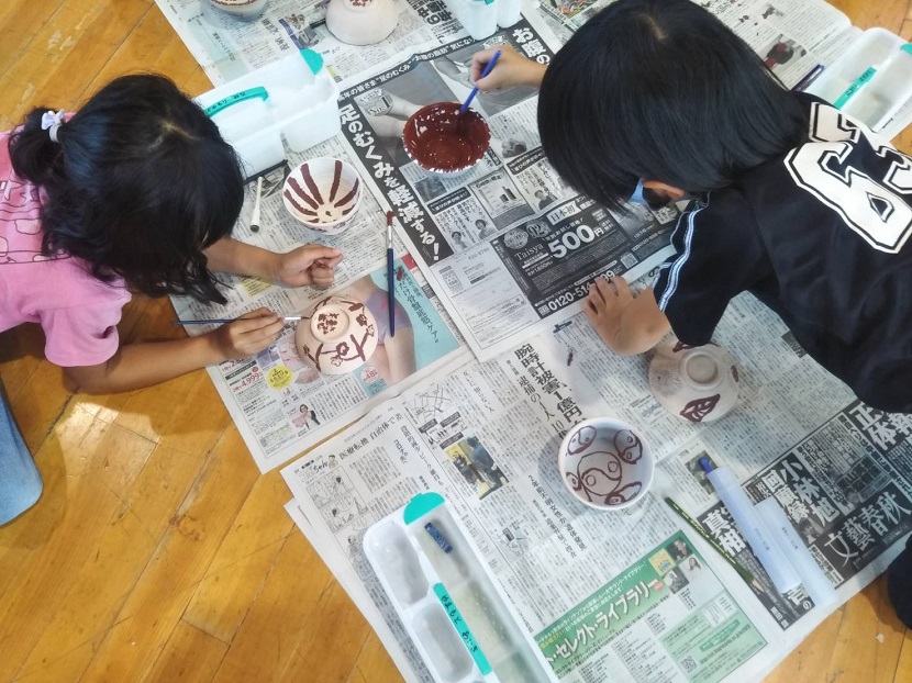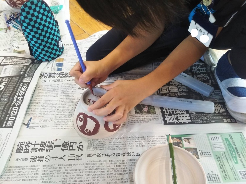 五明小学校体育館にて、五明小学校児童、幼稚園児・親子が参加し、絵付け体験をしました。
